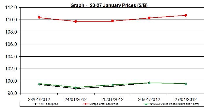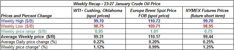 NYMEX Futures Price (February delivery) also slightly rose by 1.25% during the week, and reached $99.56/b on Friday, January 27th