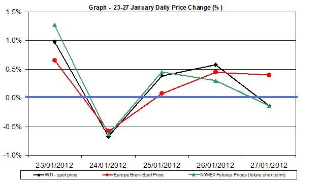 In the following charts (for the week ending on January 27th) are the changes in WTI spot oil, NYMEX Future (Short term delivery) and Europe Brent prices: