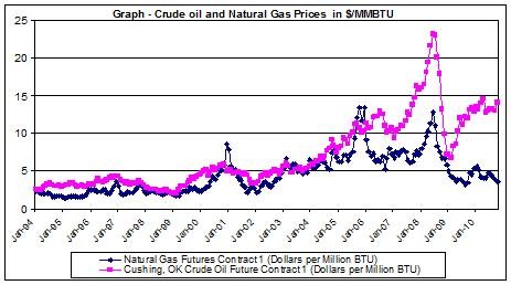 In the following graph you can see the trend of both of these commodities series, with one manipulation I have made on it: I have converted the USD/barrel of the crude oil price to USD/ MMBTU (using a 5.8 MMBTU to barrel converter rate, based on EIA reasoning). By doing so, both of these series are at equal grounds. The graph shows a close relationship between the two series, in which until the beginning of 2006, they were in similar price levels. This is also shown in the correlation between the two series in which from 1994-2008 the correlation between the percent changes of the two series is 0.306. Not great but pretty good.