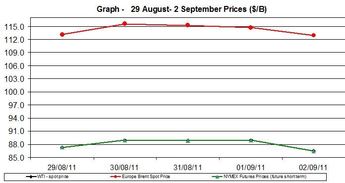 Crude spot oil prices WTI BRENT charts -  29 August- 2 September  2011