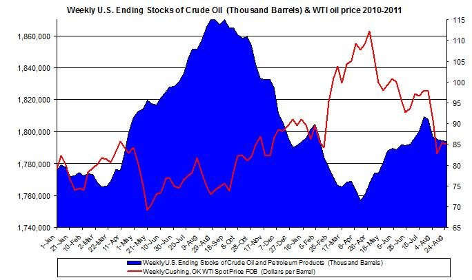 Weekly U.S. Ending Stocks Crude Oil and WTI spot oil price 2011 August 31