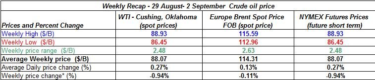 Let’s review the changes during last week (August 29th to September 2nd) of crude oil prices (Brent oil and WTI), and present a summary of the recent EIA petroleum report: