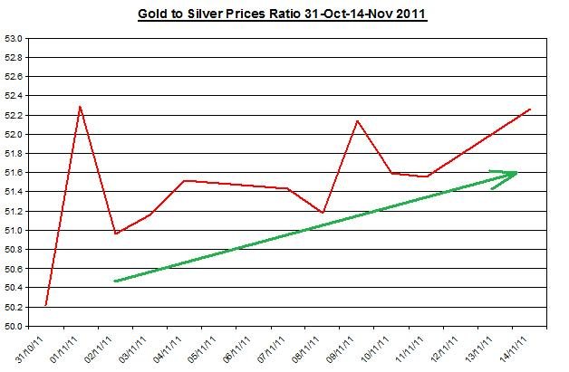 The ratio between gold and silver prices slightly rose on Monday, November 14th to 52.27. During November, gold price rose by a higher rate than silver price so that the ratio rose by 4.1%.