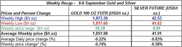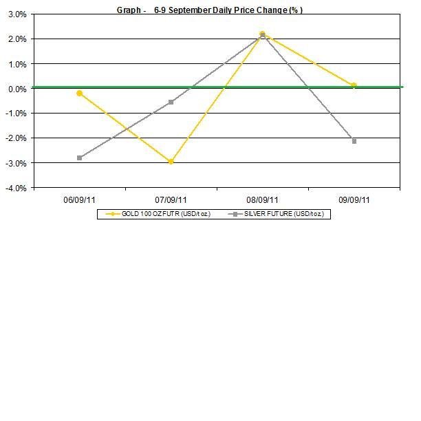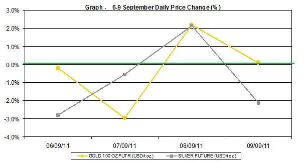 Here is a short review of the changes in gold and silver prices during the week of September 6th to September 9th 2011:
