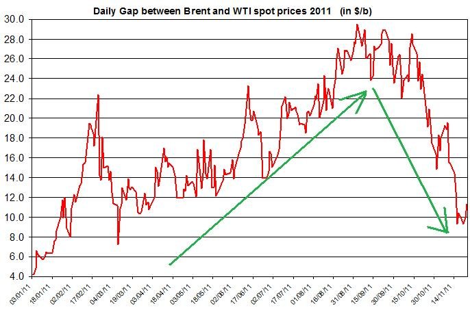 During 2011 the premium of Brent oil over the WTI reached the highest levels ever and even peaked on September 29th to a premium of $29.47. As the gap between these energy prices shrink what is next for this difference for the weeks to come?