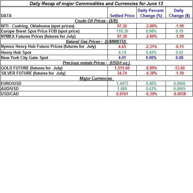 Here is a summary of the price movements of precious metals and energy commodities for June 13th: