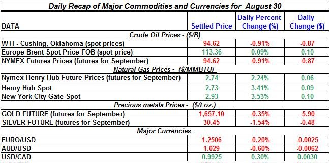Here is a summary of the daily changes in precious metals and energy commodities for August 30th, 2012:
