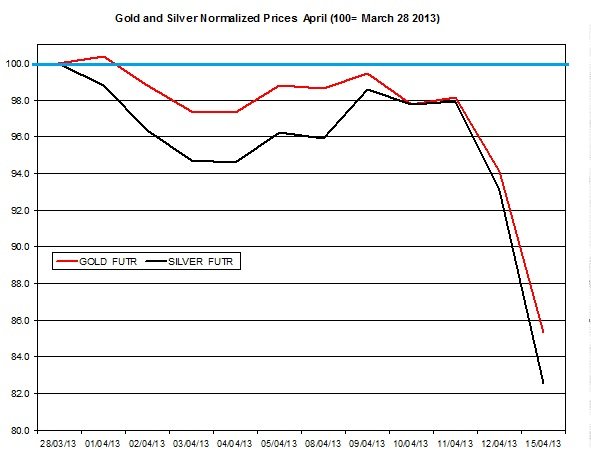 In the chart below are the normalized rates of gold and silver during April (normalized to 100 as of March 28th). The rates of gold and silver have tumbled down in the recent past.