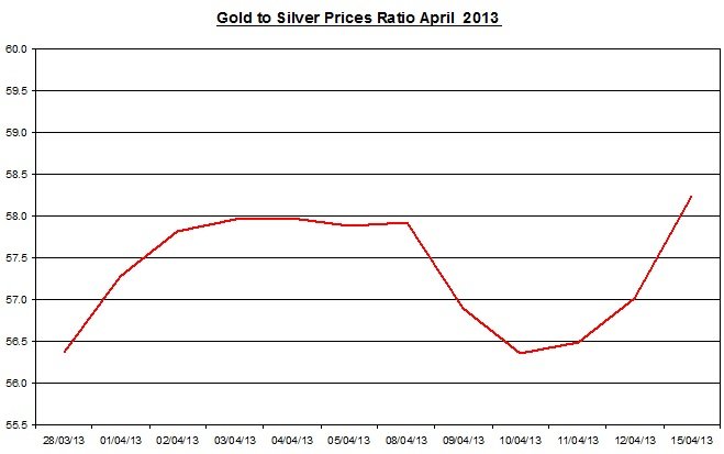 The ratio between the two precious metals rose again on Tuesday to 58.69. During April the ratio rose by 4.12% as gold slightly out-performed silver.