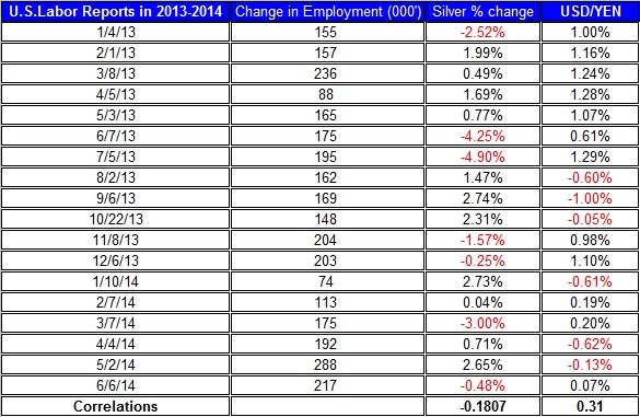 The table below shows the impact of the past non-farm payroll reports on the changes in gold, silver and USD/Yen currencies pairs in 2013-2014.