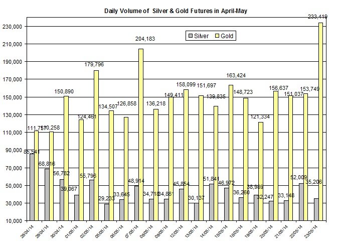 volume Gold & silver prices 2014  May 25If the volume of trade continues to rise, this might eventually translate to higher volatility.