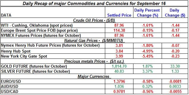 Gold and silver prices made a correction to the sharp falls they have endured in the past several days as they finished the week with sharp gains; crude oil prices ended the week falling; natural gas spot price (Henry Hub) changed direction and sharply declined yesterday. Here is a summary of the price movements of precious metals and energy commodities for September 16th: