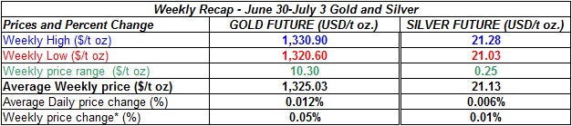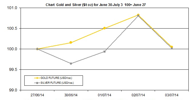table weekly gold and silver  prices June 30- July 4 2014The price of gold inched up by 0.05% last week; the average price reached $1,325.03/t. oz which was 0.42% above last week’s average rate of $1,319.5/t. oz. Gold ended the week at $1,320.6/t. oz.