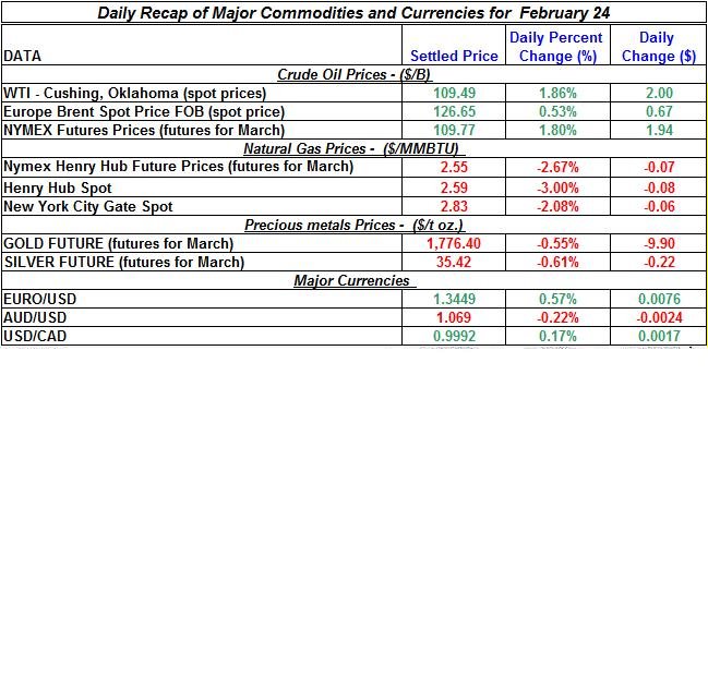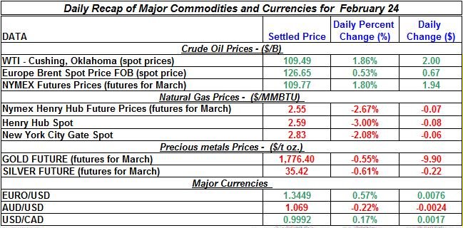 Crude oil continued to trade up on Friday; on the other hand gold and silver prices changed direction and slightly declined; natural gas prices also sharply fell yesterday. The Euro appreciated again against the US Dollar while many other major currencies (Aussie dollar) fell against the U.S dollar. Here is a summary of the developments of precious metals and energy commodities for February 24th, 2012: