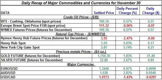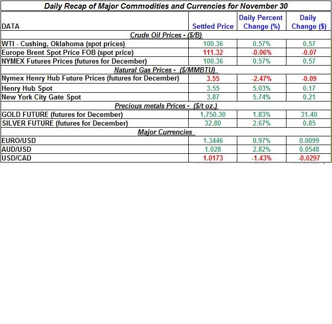 Major commodities ended November on a positive note as their prices inclined along with the rest of the major financial markets including the American and European stock markets; this rally came following the announcement that five prime Central banks including the Federal Reserve will lower the cost of their dollar funding to the struggling European banks. Gold and silver prices sharply rose. Crude oil price (WTI) also slightly inclined. Natural gas spot price (Henry Hub) ended the month rising as well and further shrinking the gap between the spot and future price. Major currencies such as Euro sharply appreciated against the US dollar. Here is a summary of the price movements of precious metals and energy commodities for November 30th: