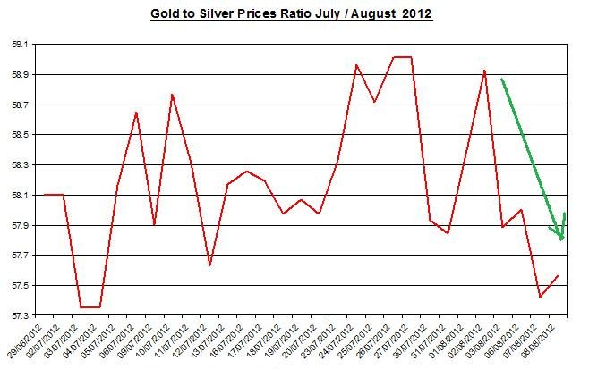 The ratio between the two precious metals rose on Wednesday to 57.56. During August the ratio edged down by 0.49% as gold slightly under-performed silver.