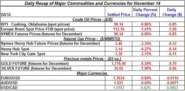 Major commodities prices changed direction and started the week with moderate falls; many currencies including Euro, CAD and AUD depreciated against the US dollar; gold and silver prices moderately declined; crude oil prices also changed direction and slipped; natural gas prices continue their free fall and sharply declined again. Here is a summary of the price movements of precious metals and energy commodities for November 14th: