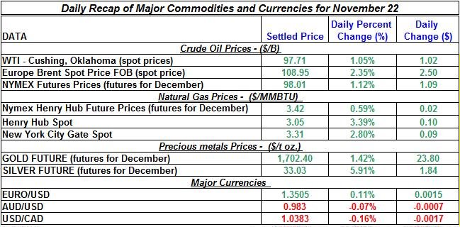 Gold and silver prices bounced back from the sharp falls they have had on Monday. Other commodities prices also followed and inclined yesterday: Crude oil prices ended yesterday’s trading in the green; natural gas prices also changed direction and sharply inclined on Tuesday. Many currencies including Euro and Canadian dollar appreciated against the US dollar. Here is a summary of the price movements of precious metals and energy commodities for November 22nd: