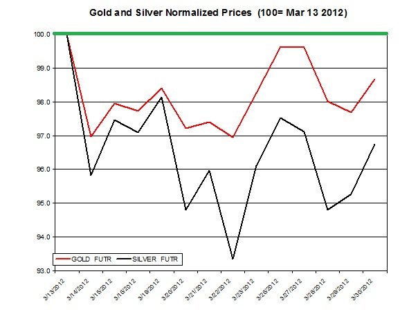 The chart above shows the changes in gold and silver prices during the past couple of weeks (prices are normalized to March 13th). The chart shows the fall and rise of precious metals prices.