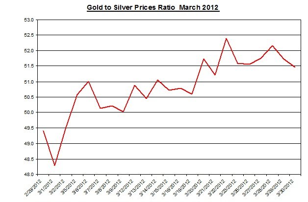The ratio between gold and silver edged down to 51.47. During the month the ratio rose by 4.19% as silver has underperformed gold. In the chart below are the changes in this ratio during the month.