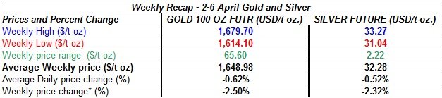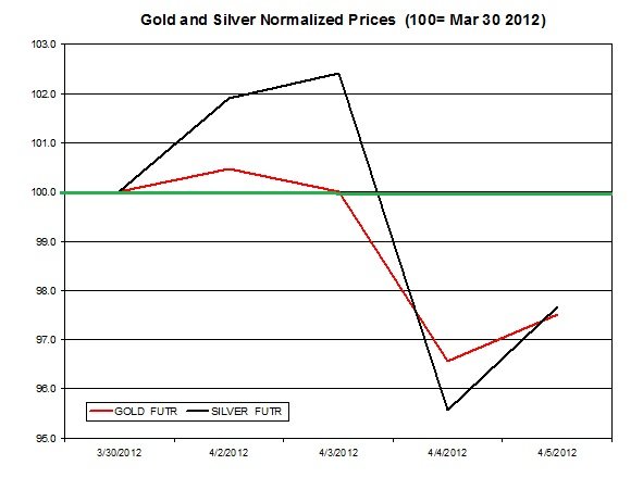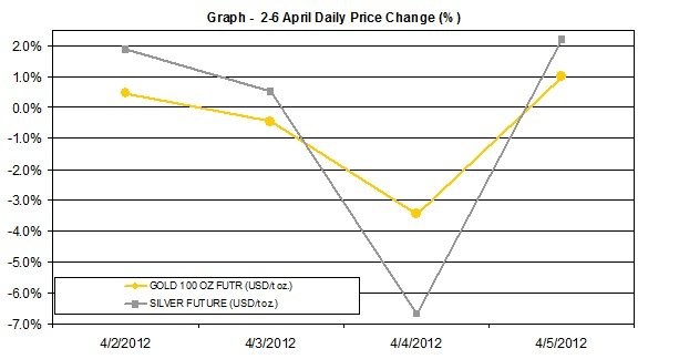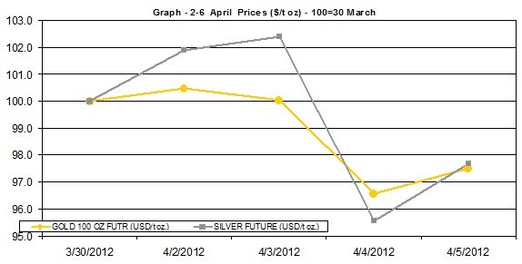 Here is a short summary of the changes in gold and silver prices between April 2nd and April 6th 2012: