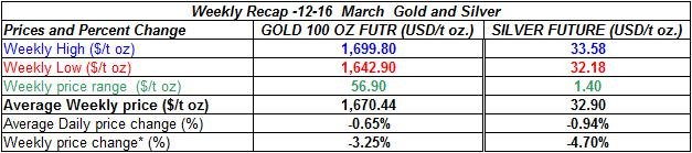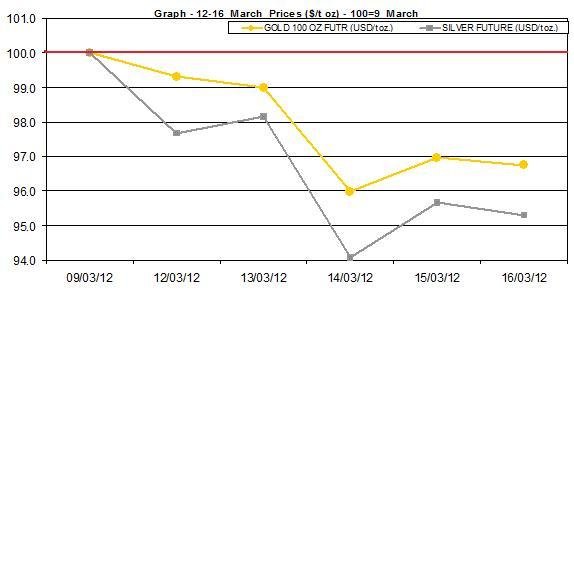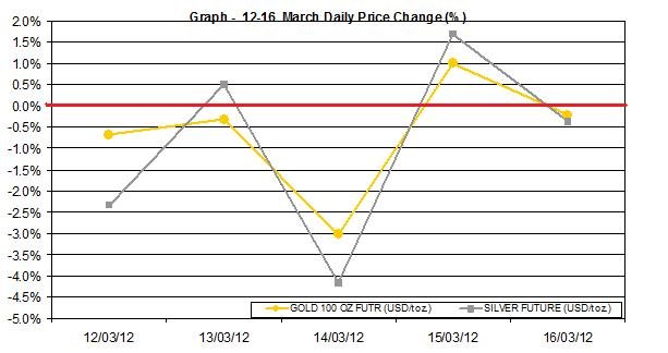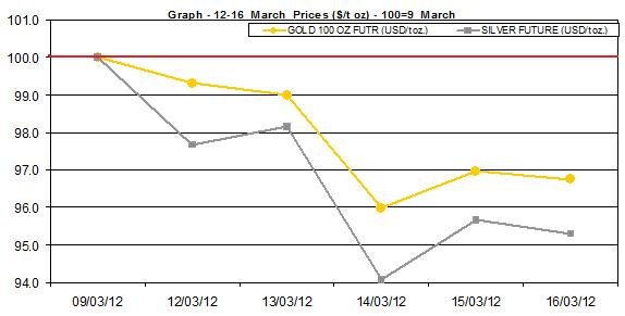 Here is a short summary of the changes in gold and silver prices between March 12th and March 16th 2012: