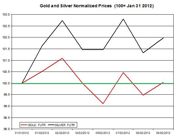 The chart below shows the development of gold and silver during February (metals prices are normalized to 100= January 31st).