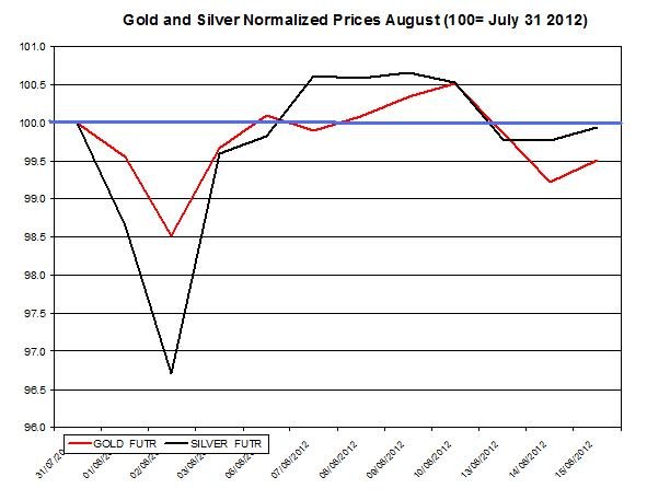As seen below, the chart shows the changes of normalized prices of precious metals in during the month (normalized to 100 as of July 31st). During the month gold and silver remained nearly unchanged.