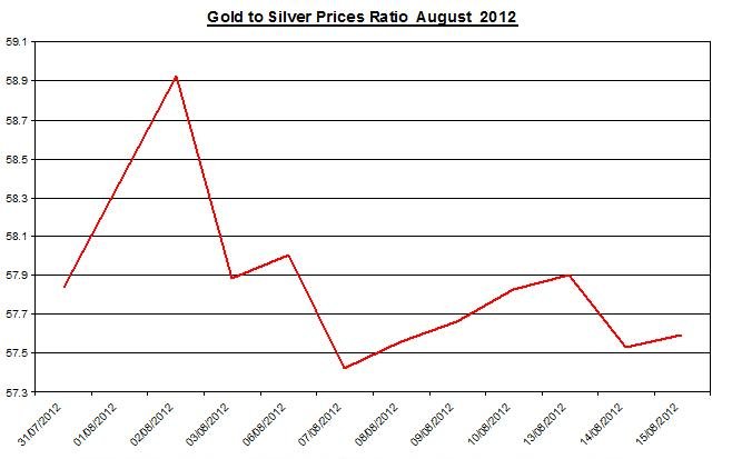 The ratio between the two precious metals rose on Wednesday to 57.59. During August the ratio edged down by 0.43% as silver slightly out-performed gold.
