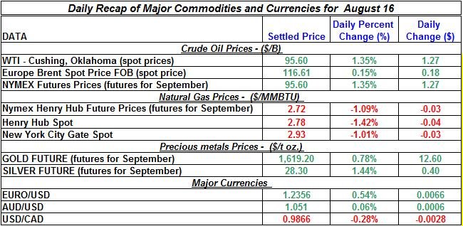 Here is a summary of the daily changes in precious metals and energy commodities for August 16th, 2012: