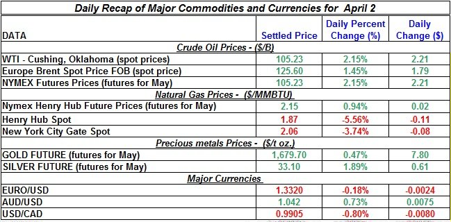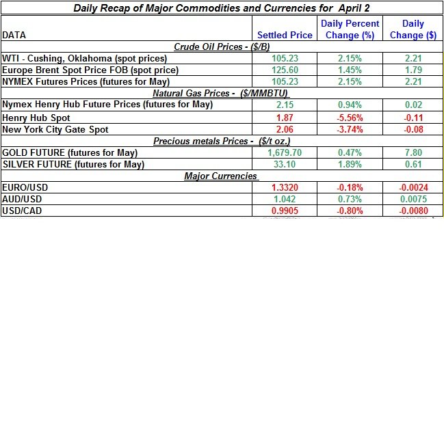Here is a summary of the changes in precious metals and energy commodities for April 2nd, 2012:
