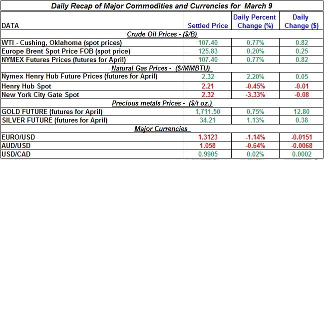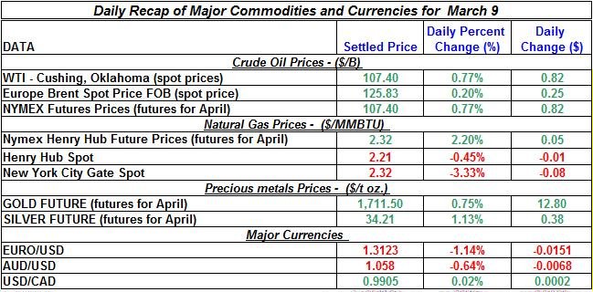 Here is a summary of the changes in precious metals and energy commodities for March 9th, 2012: