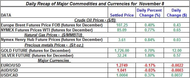 Here is a summary of the daily developments of precious metals and energy commodities for November 8th, 2012: