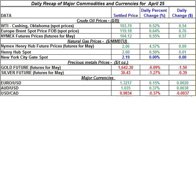 Here is a summary of the developments in precious metals and energy commodities for April 25th, 2012: