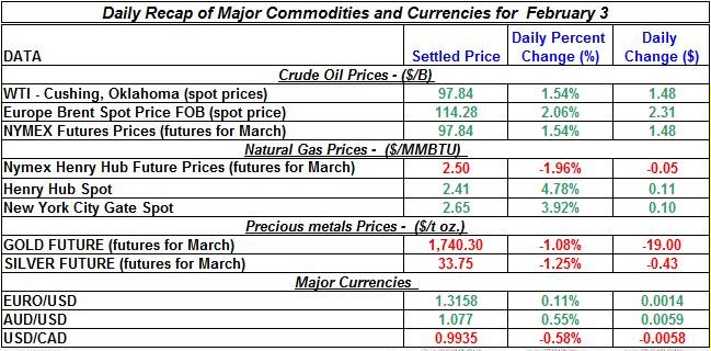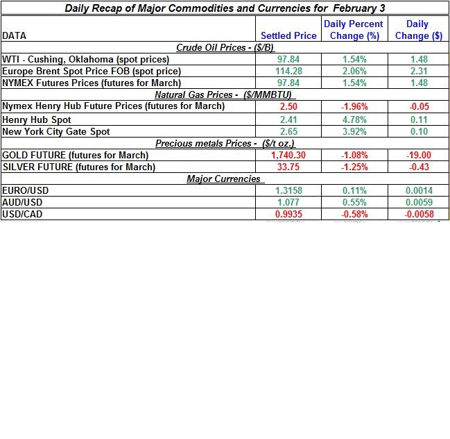 Gold and silver prices changed direction on last day of the week and were traded down. Crude oil (WTI) price also shifted gear and bounce back from its downward trend of past days. These shifts may have been stem, in part, from the recent US non-farm payroll report, which showed an increase of 243 thousand in January. Natural gas future price declined yesterday. The Euro and many other currencies slightly rose yesterday against the U.S dollar. Here is a summary of the developments of precious metals and energy commodities for February 3rd, 2012:
