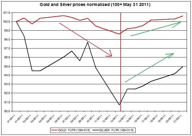 The chart below shows the normalized gold and silver prices (May 31st 2011=100).
