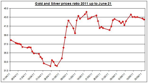 The gold to silver ratio: As of Tuesday, June 21st the ratio between gold and silver prices continue to hover near the 43 mark as it dropped yesterday to 42.51; during June this ratio inclined by 6.0%, which means that gold price has outperformed silver price during June.