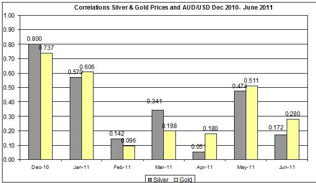 One of the major exchange rates that demonstrated strong correlation with gold and silver prices in the past was Australian dollar to USD. As seen below, during June the linear correlation was still positive but weaker than during May.
