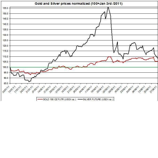 The chart below shows the normalized gold and silver prices (January 3rd 2011=100).