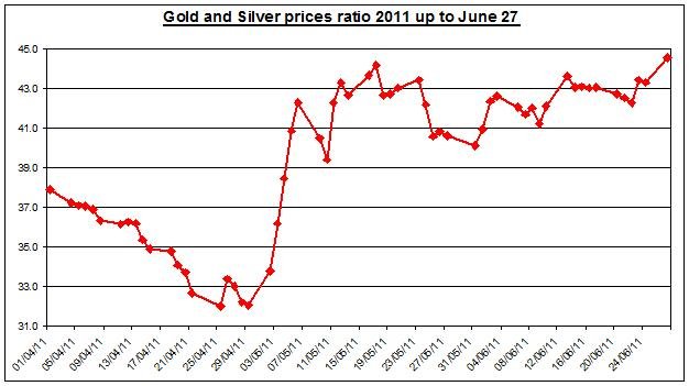 The gold to silver ratio: As of Monday, June 28th the ratio between gold and silver prices rose to 44.54; during June this ratio augmented by 11%, which means that during June gold price has outperformed silver price.