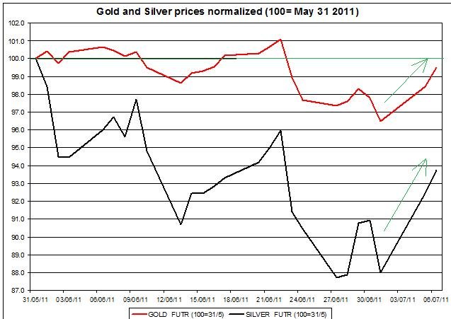 The chart below shows the normalized gold and silver prices (May 31st 2011=100). It shows, that gold price is nearing its price level back in the end of May; silver price is still well below its price level back in May 31st, despite its recent rally.