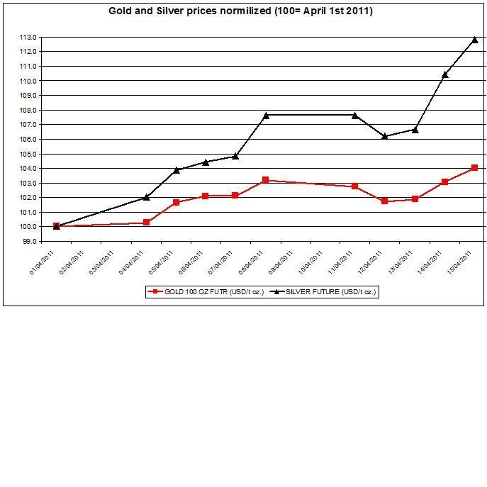 In the chart below are the changes of gold and silver prices during April 2011, normalized to 100=April 1st 2011; the chart shows how silver prices have outperformed gold prices mainly since the end of last week: