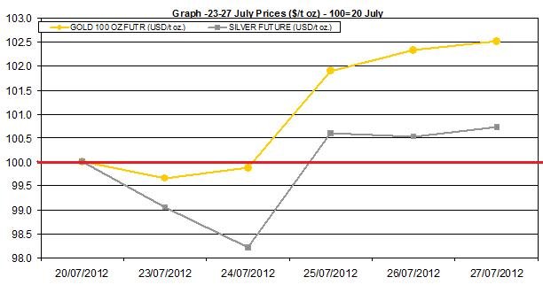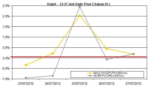 Precious metals started off the week in the same direction from the previous week – trading down. This direction changed coming Wednesday when both metals along with other commodities rates and “risk currencies” rose. The news of the contraction of GB’s GDP during Q2 and ECB President Mario Draghi’s statement to preserve the Euro helped rally these markets. The decline in number of new home sales sold and the pending home sales may have also contributed to the weakening of the USD. The jobless claims changed direction and declined to 353k. On Friday U.S GDP estimate for Q2 was released and showed the U.S economy expanded by only 1.5%, which wasn’t much different than many had anticipated.