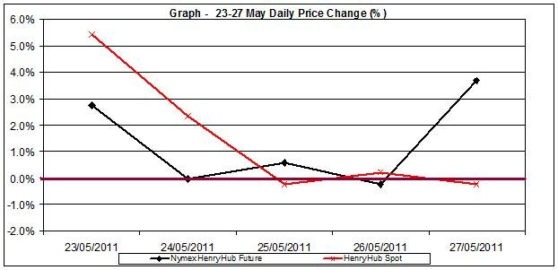 The following chart shows the daily changes of natural gas prices 2011 (Henry Hub) and futures prices (Nymex Henry Hub) in $/mmbtu during the week of May 23-27.