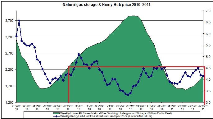 The chart below shows the natural gas storage (weekly figures) and Henry Hub natural gas prices during 2010 and 2011; the chart demonstrates the rising NG storage and the fall in the NG prices at the first couple weeks of May.