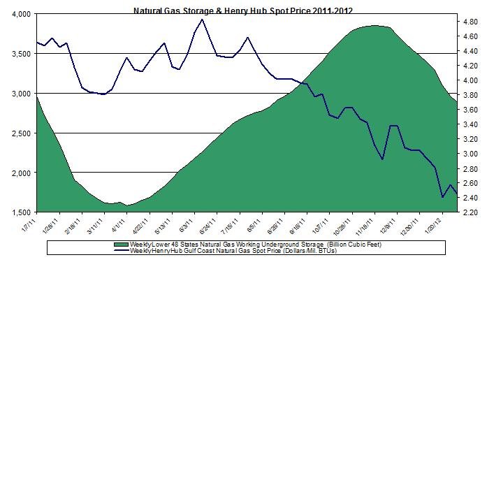 In the following chart are the developments of natural gas storage (weekly figures) and Henry Hub natural gas prices during 2011-2012. During last week the Henry Hub spot price sharply fell to a weekly average price of $2.45/mmbtu. The Henry Hub price was $2.06/mmbtu below its price level the same week in 2011.