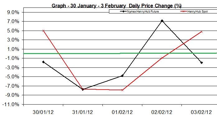 The following charts demonstrate the changes of natural gas (Henry Hub) and futures prices (Nymex Henry Hub) in $/mmbtu between January 30th and February 3rd.