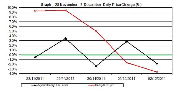 The following charts present the daily changes of natural gas prices (Henry Hub) and futures prices (Nymex Henry Hub) in $/mmbtu during November 28 to December 2.