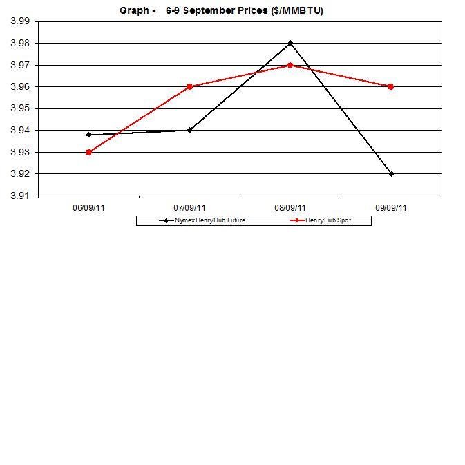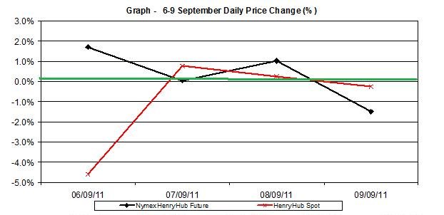 The following chart shows the daily changes of natural gas prices (Henry Hub) and futures prices (Nymex Henry Hub) in $/mmbtu during September 6- September 9.