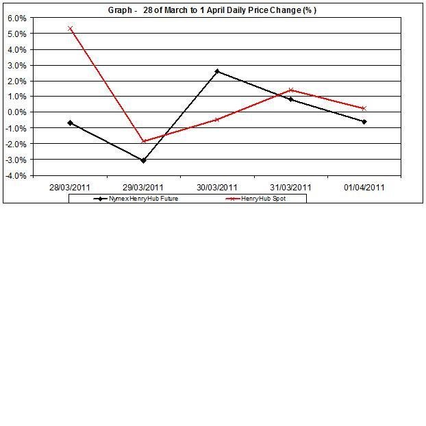 The following chart shows the daily changes last week in natural gas spot price (Henry Hub) and futures price (Nymex Henry Hub) in $/mmbtu. It shows how didn’t show a clear trend during: